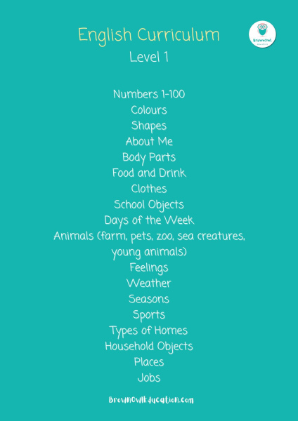 This course introduces basic everyday ocabulary and sentence formations, such as simple questions and answers. (See attached image for the full curriculum).