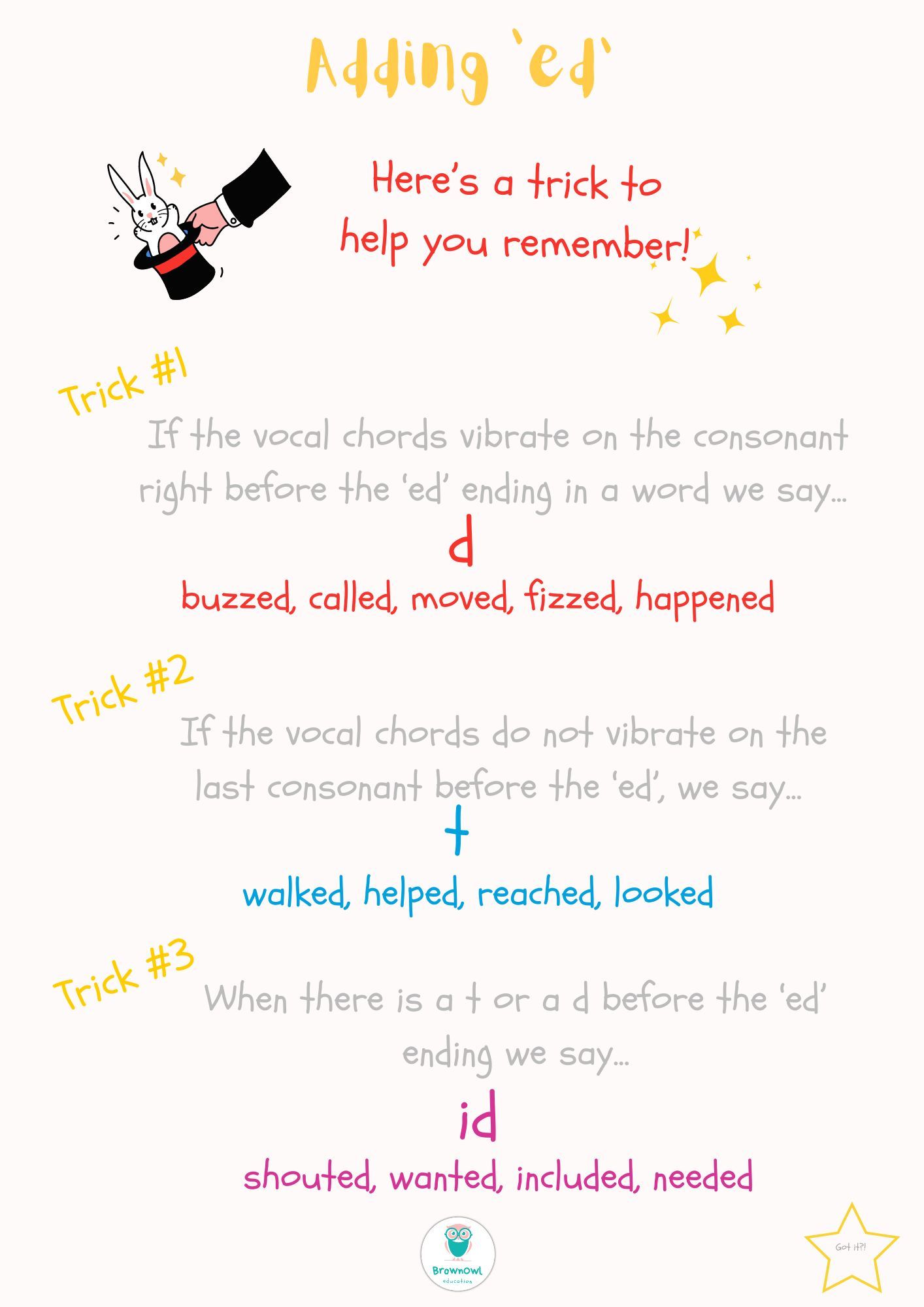 The pronunciation of 'ed', as in 'stopped, hunted, laughed...just how do we pronounce these? The ending of each one of those three verbs has its own distinct sound. It's not stop-Ed, or hunt-Ed, or laugh-Ed, so how do we remember the correct pronunciation of these words? Of course, as a native speaker it's second nature*, just like riding a bike! However, for students who are learning English as a second, or perhaps, third language, some rules apply. Now, if you have ever witnessed one of my classes, you will know, that I'm not a firm believer of rules, however sometimes, just sometimes, they have their place, and this is one of those times!